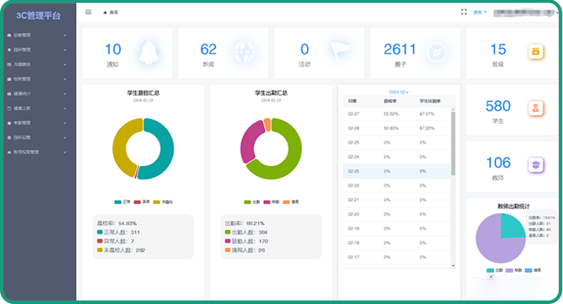 4、出勤/考勤:全市/全区在册幼儿园儿童出勤状况,教师考勤状况,及儿童请假状况了解;
